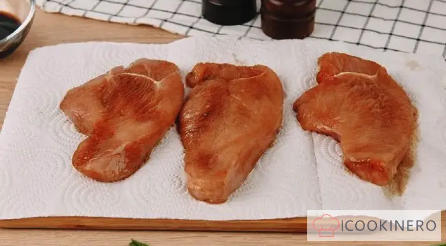 Legen Sie die Putenbrüste auf Papiertücher, um überschüssige Soße abtropfen zu lassen.