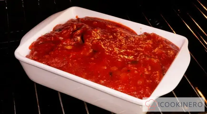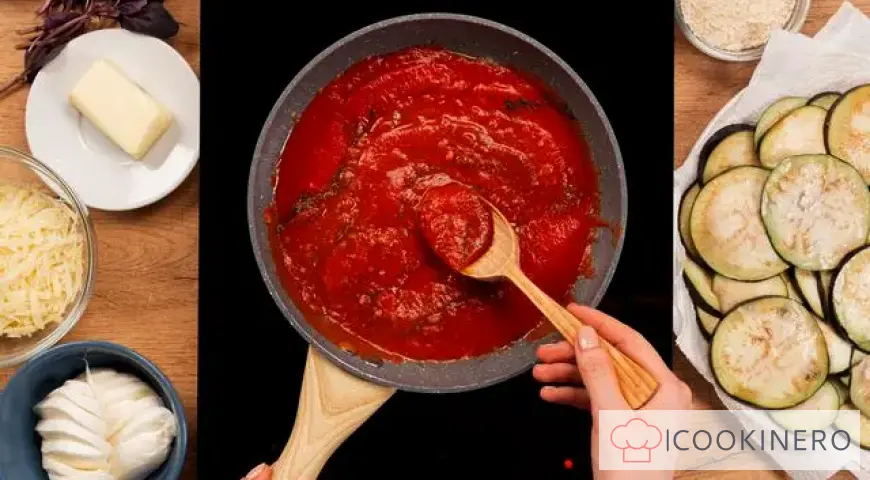 Während die Feuchtigkeit aus den Auberginen entweicht, bereiten Sie die Bratmischung zu. Eine Bratpfanne erhitzen, Öl hineingeben, fein gehackte Zwiebel und Knoblauch hinzufügen. Bei mittlerer Hitze goldbraun braten und Dosentomaten im eigenen Saft hinzufügen. Die Tomaten etwas zerdrücken. Salz, Pfeffer, Gewürze nach Geschmack und Basilikum hinzufügen und umrühren. Zum Kochen bringen, Hitze reduzieren und 15 Minuten köcheln lassen.