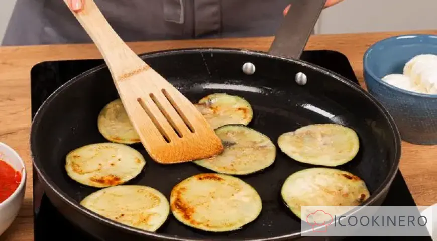 Eine Bratpfanne erhitzen, Öl hineingeben und die Auberginen von beiden Seiten goldbraun braten. Legen Sie die gebratenen Auberginen auf ein Papiertuch, um überschüssiges Öl aufzusaugen.