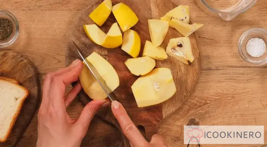 Bereiten Sie die Quitte vor. Schneiden Sie jede Frucht in Spalten. Die Kerne entfernen, die Schale aber dran lassen.