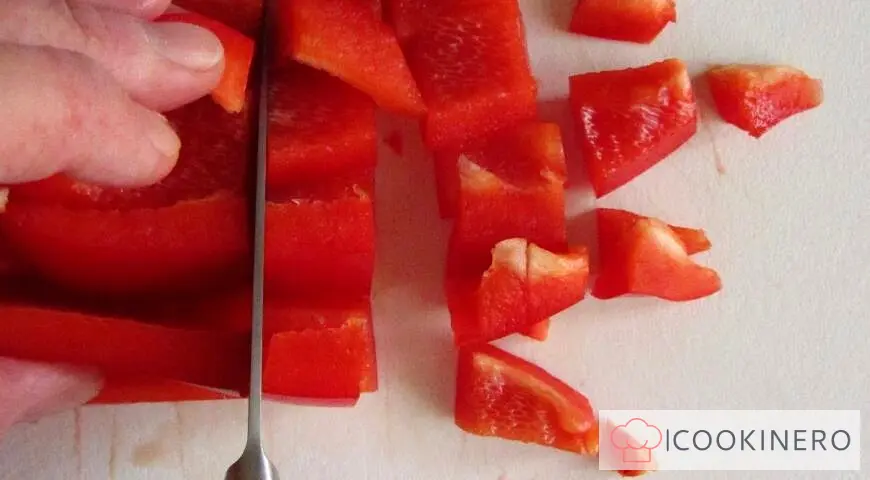 Halbieren Sie die Paprika, entfernen Sie den Stiel, die Samen und die inneren Trennwände und schneiden Sie sie dann in große Würfel. Zum Gemüse in eine Salatschüssel geben.