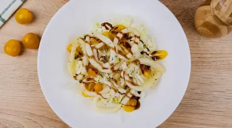 A fresh, light salad with squid and cherry tomatoes will be a successful cold appetizer for lunch or a snack. A low-calorie dish, rich in fiber and protein, is quickly digested, gives an original, rich taste. This salad will fit perfectly into the su