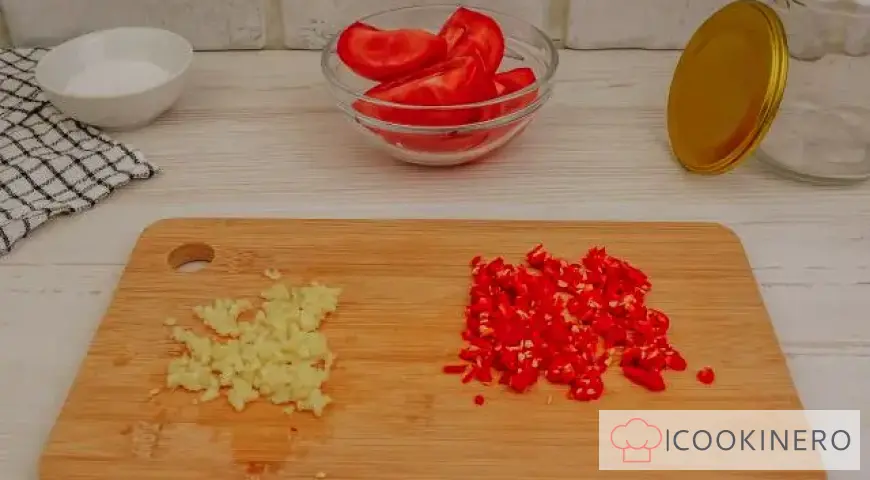 Remove the stem and seeds from the chili pepper and cut it into slices.