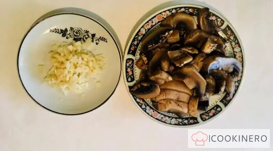 Boil the mushrooms and cut into slices after cooling, also finely chop the garlic.