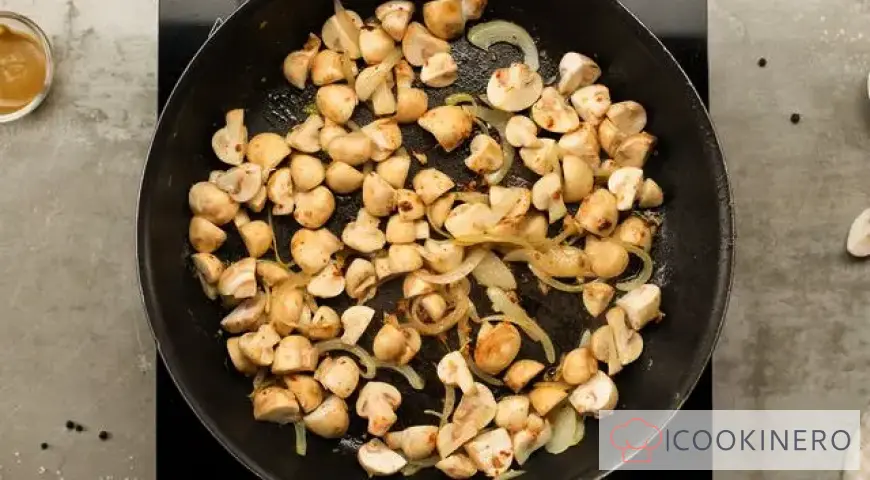 Fry the onion and garlic in melted butter, then add the mushrooms, salt and fry until golden brown.