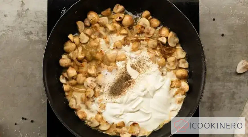 Combine the mushroom juice with sour cream, mustard and pepper. Pour the mixture over the mushrooms and simmer everything together for another 2–3 minutes over low heat.