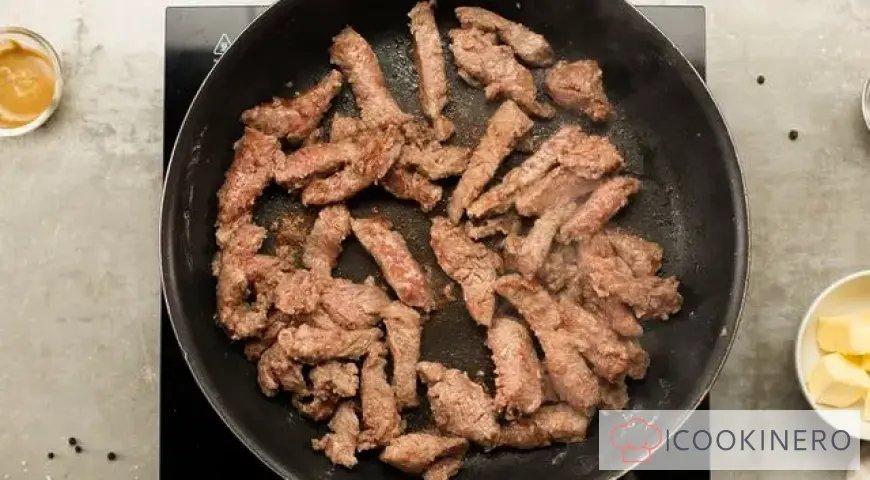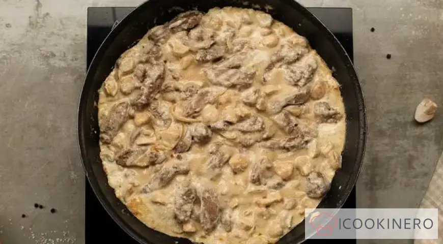 A dish for those who want to eat well during lunch, not just have a snack! Beef stroganoff with mushrooms in a creamy sauce is a hearty, tasty and not very difficult to prepare dish. The classic beef stroganoff recipe includes only beef, but if you have champignons in the fridge, add them too.