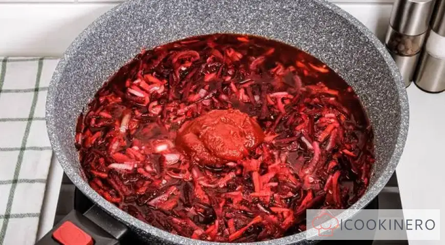 Add tomato paste, 0.5 teaspoon of sugar and half a glass of prepared broth to the pan.