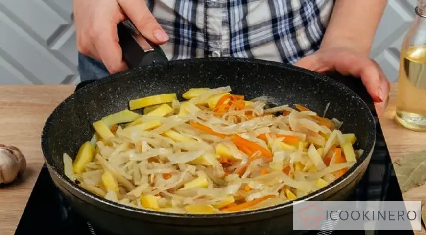 Chop the vegetables into thin strips or grate them on a coarse grater. Fry the onion and carrot until half-ready, add the potatoes and garlic, reduce the heat and keep the lid on until done.
