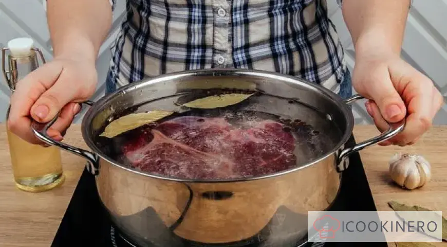 Place the pan on low heat, pour water in and put the beef meat in. Add bay leaf, salt and pepper. When the water starts to boil, adjust the flame so that the water is just bubbling and cook with the lid half-closed for 50 minutes.