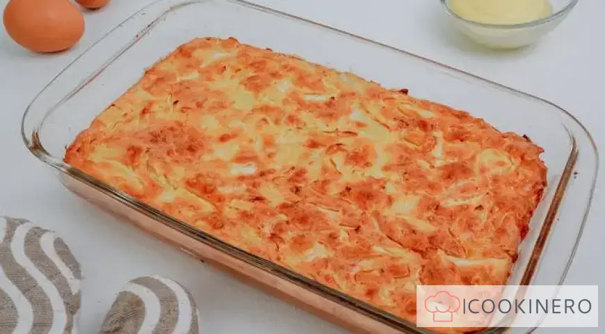 Check the readiness of the pie by inserting a wooden skewer into the center of the pie. If the skewer comes out dry, the pie is ready. Remove it from the oven and let it cool for about 10 minutes.