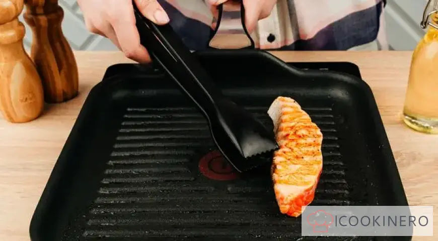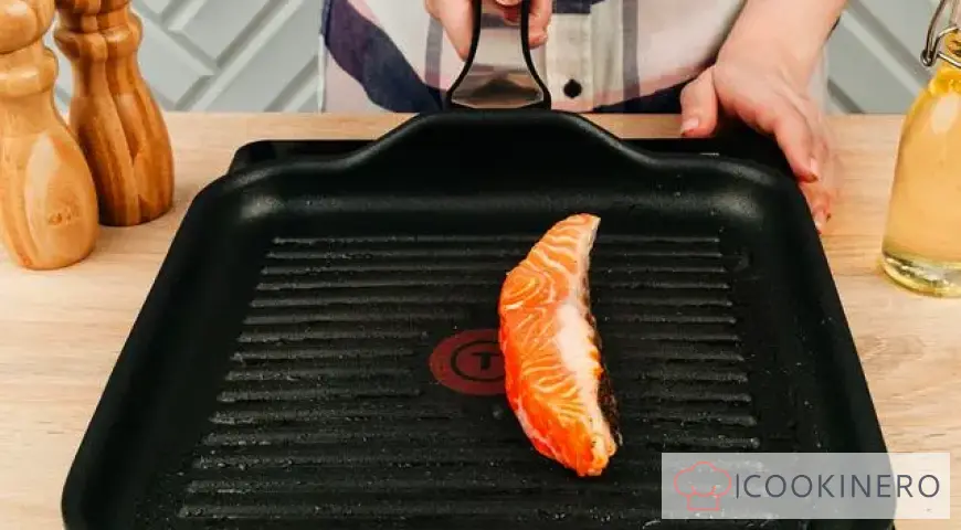 Heat a grill pan with a drop of sunflower or olive oil, add the salmon steak and fry for about 4-5 minutes until golden brown.