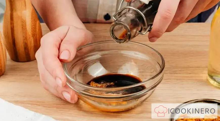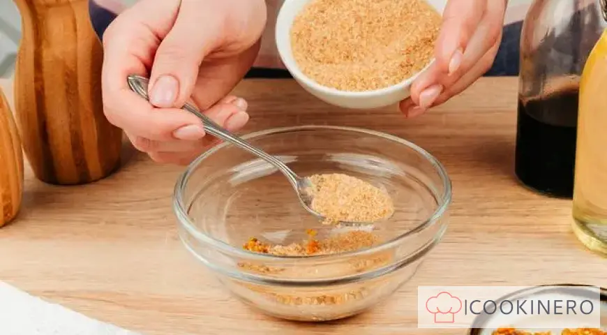 Let's start cooking the fish. In a small bowl, combine the honey, Dijon mustard and breadcrumbs, mix well.