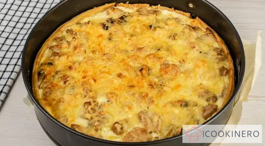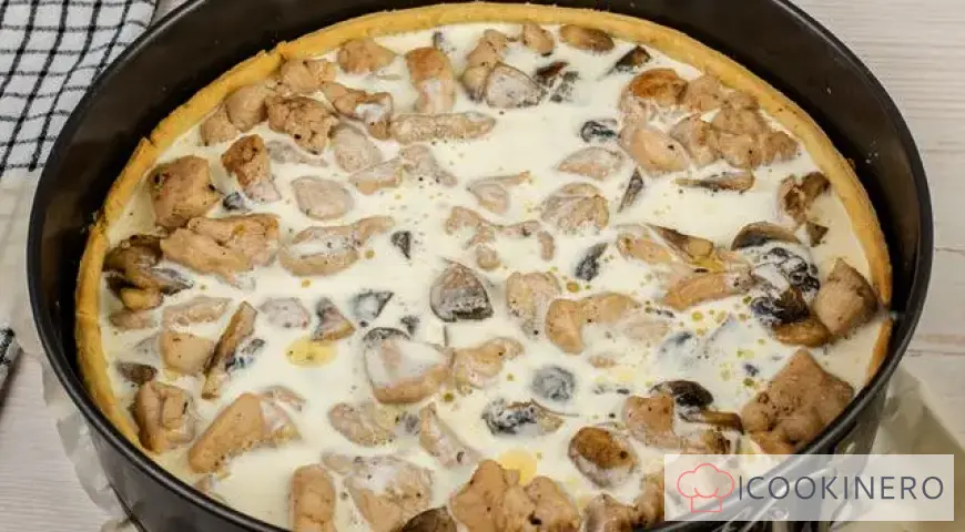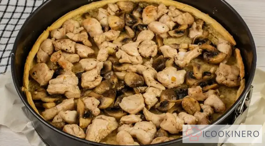 Quiche is a French dish that is an open pie with a filling. Traditionally, shortcrust pastry with a high butter content is used. The filling can be any, but it must include the following ingredients: milk, eggs, and cheese. This recipe uses chicken and mushrooms in the filling - a very popular combination that many will like. Chicken and mushrooms are poured with an egg-milk mixture, and grated cheese is sprinkled on top. The pie turns out tender and delicious.
