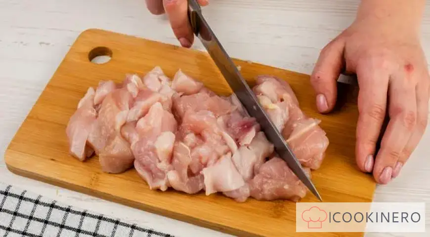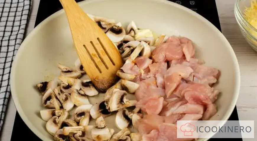 Fry the chicken and mushrooms in vegetable oil for 5-7 minutes. Add salt and pepper.