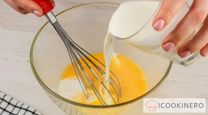 Pour the creamy egg mixture over the chicken and mushrooms.
