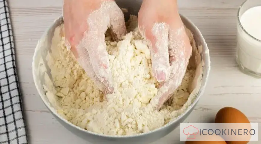 In a deep bowl, mix flour with butter until it forms crumbs.