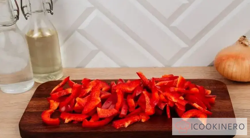 Cut the bell pepper into strips. Cut the carrots and onions into half rings, and chop the garlic into small cubes.