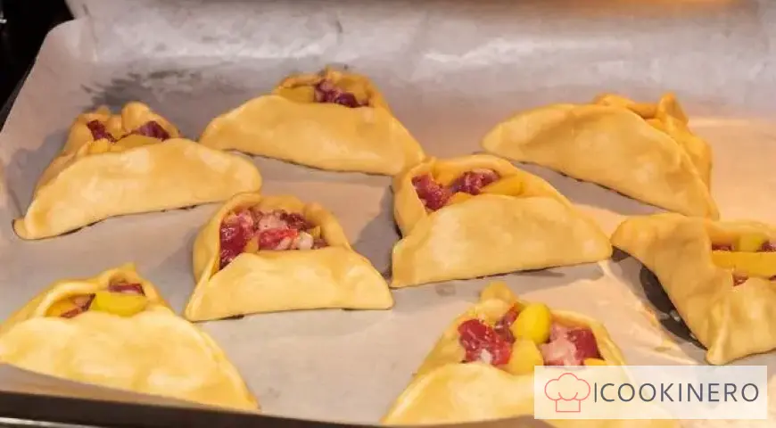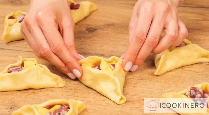 Make the pies. Divide the dough into small pieces, roll each into a flat pancake and put the filling on it. Fold the edges of the dough to the center to form a triangle, but leave a hole in the middle.