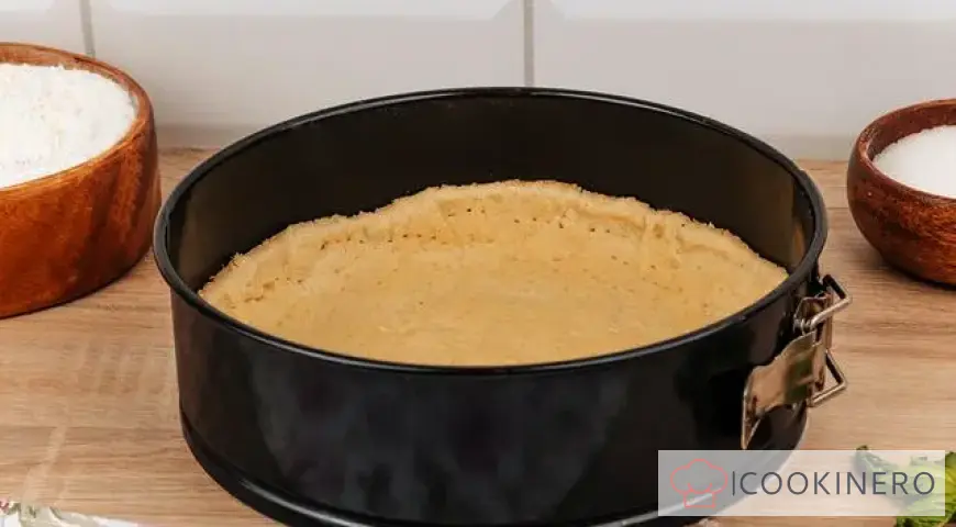 Place the dough in a baking dish, using your hands to form the base of the pie and the sides. Prick the base of the pie with a fork in several places.
