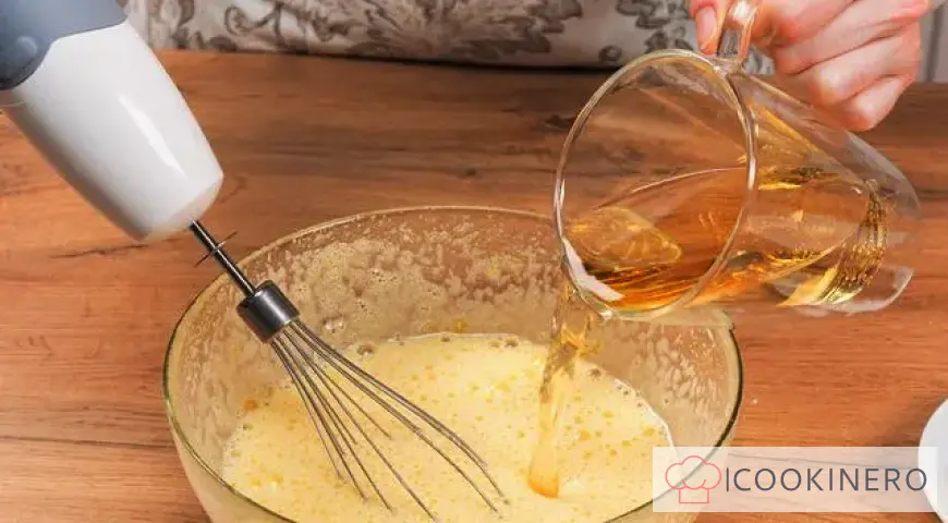 Beat eggs and sugar with a mixer for 5 minutes. The mass should triple in size.