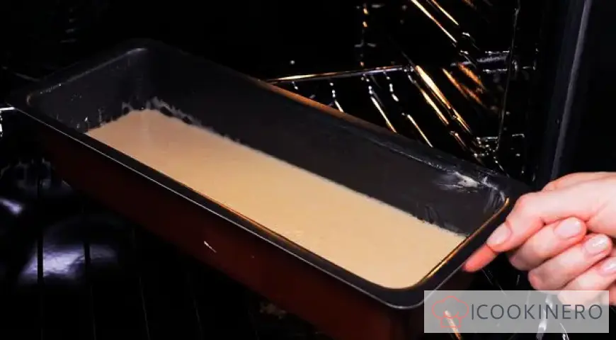 Line a baking pan with parchment paper and pour the dough into it. Place the pan in a preheated oven for 30-35 minutes. Leave the sponge cake in the oven for 20 minutes and do not open the oven door during this time.