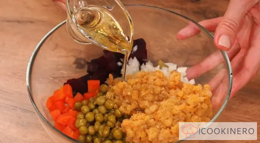 Prepare the salad. Finely dice the onion, pickles, beets and carrots. Place all ingredients in a salad bowl with the lentils. Add canned peas, pour in vegetable oil and mix gently.