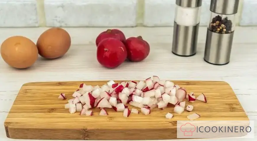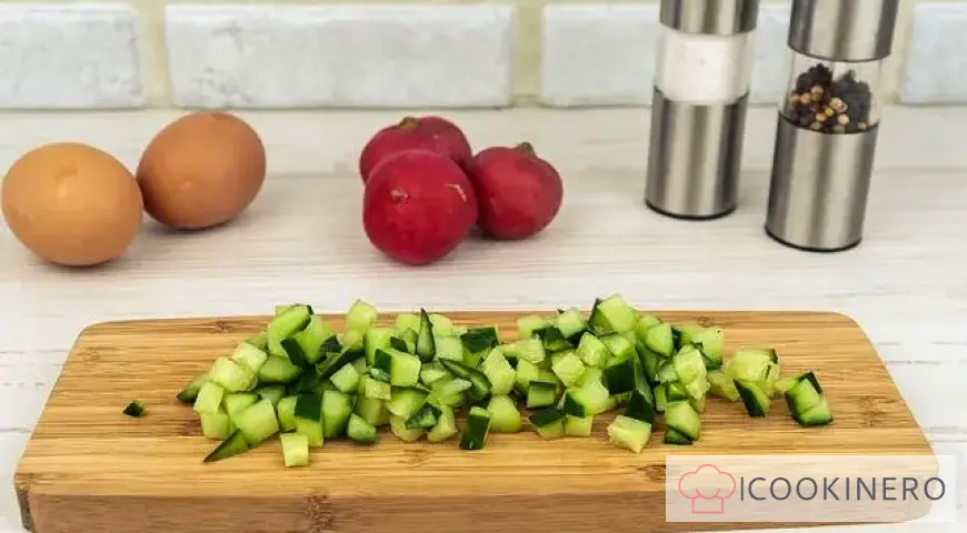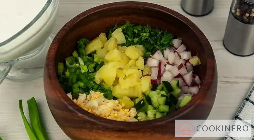 Once you mix all the chopped ingredients, the okroshka will be ready. All that remains is to divide it into portions and season each with kefir, sour cream or mayonnaise.