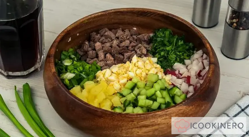 Mix everything you have cut in some deep dish. The dish is ready, all that remains is to season it with sour cream or mayonnaise to taste and pour in kvass. But it is better to do this only with individual portions that are already distributed on plates.