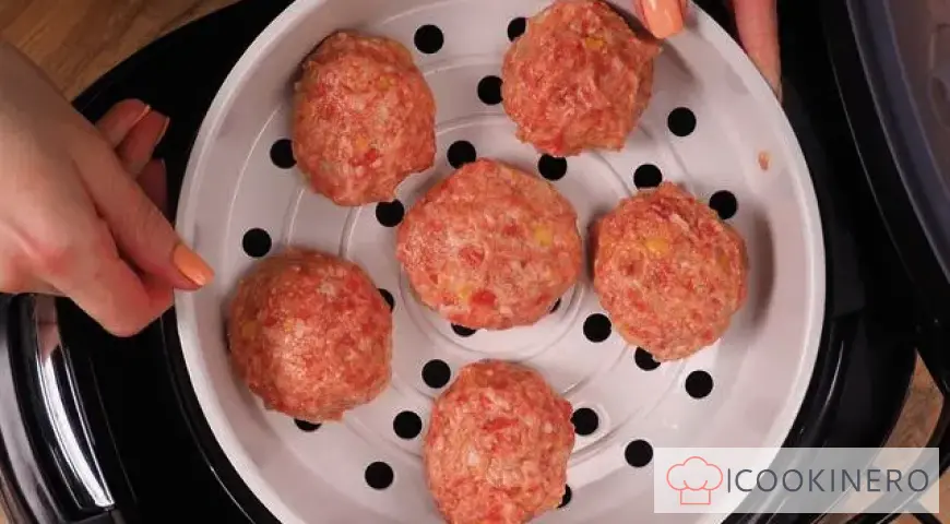 Prepare the cutlets. Add onion, potatoes, soaked bread and garlic to the pork mince. Then add the egg, salt and mix until smooth. Form the mince into cutlets and place them in the steamer bowl. Set the timer for 25 minutes.