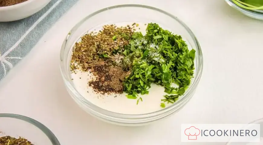 Prepare the sour cream and garlic sauce. To do this, mix sour cream, greens, chopped garlic, dried herbs, salt and pepper in a bowl.