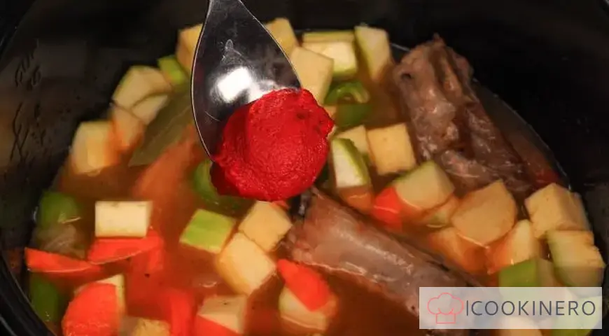 Prepare a side dish for the ribs. Place the chopped vegetables (peppers, carrots and zucchini) in the multicooker bowl. Salt the dish to taste and add 1 tsp. of tomato paste. Since the vegetables themselves are juicy, there is no need to add water to the stew. Set the multicooker to the "Stew" or "Simmer" mode, set the timer for 15 minutes.