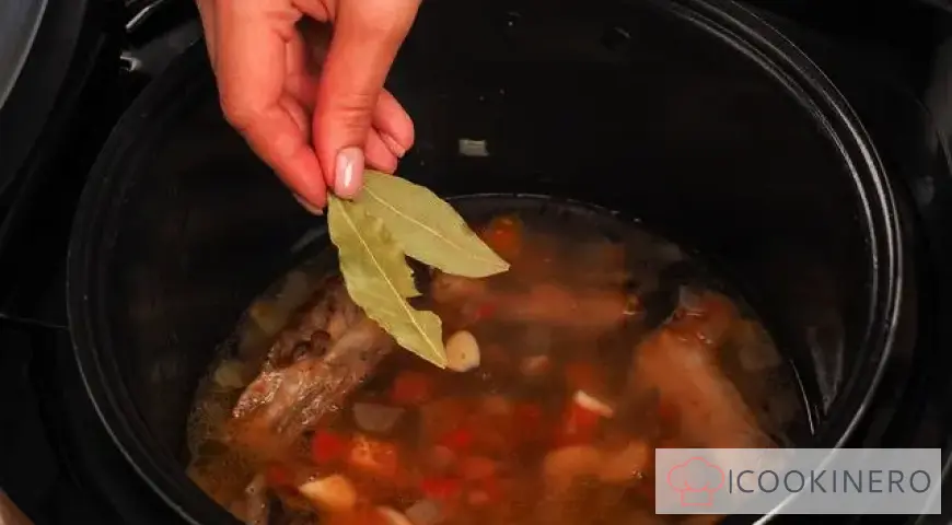 Put the ribs and vegetables to stew. Pour in the broth or water, garlic and bay leaf. Set the "Stewing" mode for 30 minutes, then switch the multicooker to the "Bake" mode, set the timer for 45 minutes.