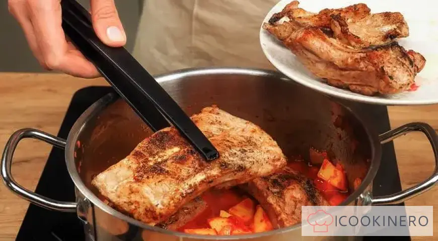 Fry the ribs. Rub the ribs with salt, pepper and paprika. Let stand for 5 minutes. Then, in the same pan in which you will cook the dish, heat the oil and fry the ribs over high heat until golden brown, about 5-7 minutes. No need to bring to readiness. Remove the ribs from the pan.