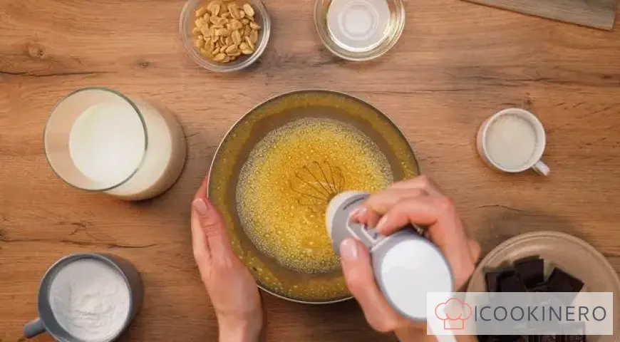 Start preparing the dough. Take a deep bowl and break the eggs into it, add a pinch of salt. Beat them with a whisk or mixer until foamy.
