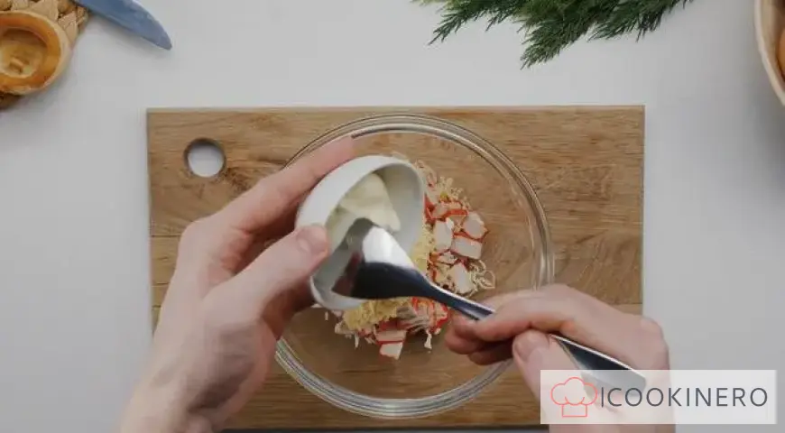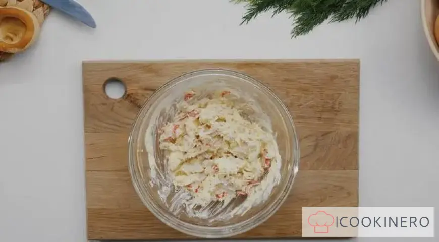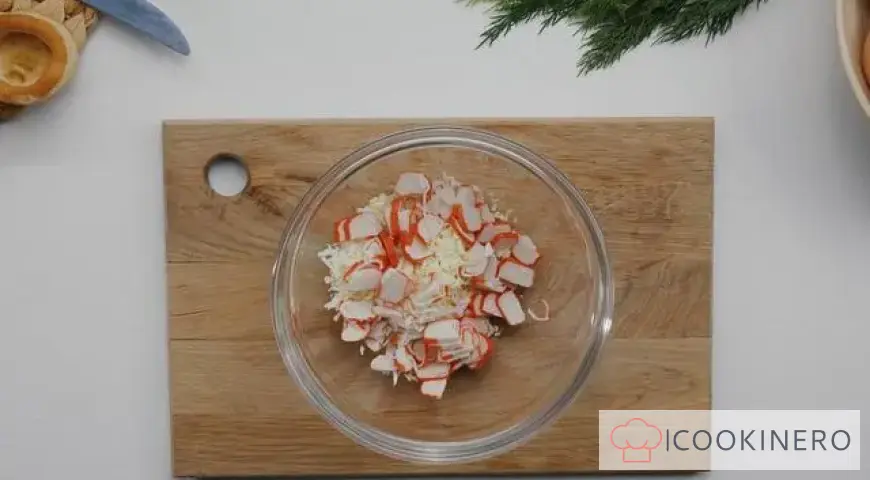 Place the chopped crab sticks and chopped chicken eggs into a deep bowl.