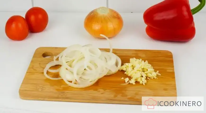 Pelar la cebolla y cortarla en aros. Picar finamente el ajo.