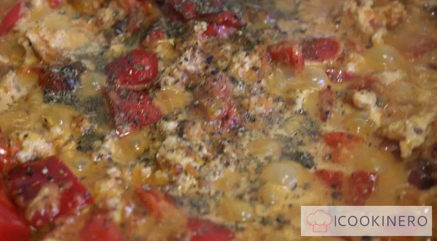 Sal, pimienta, agregue una mezcla de hierbas y caldo. Cocine a fuego lento durante 7-10 minutos.