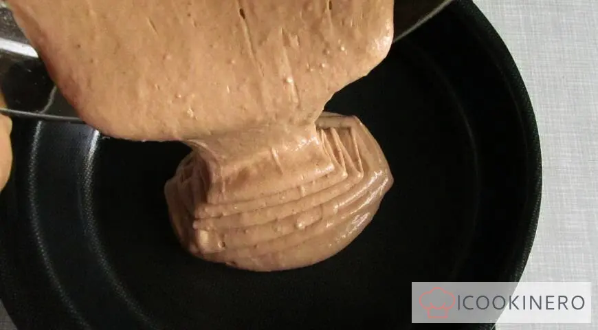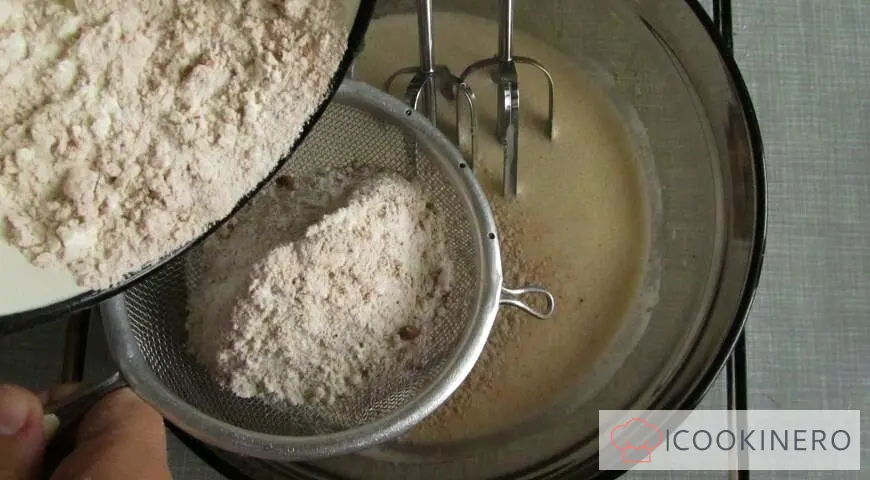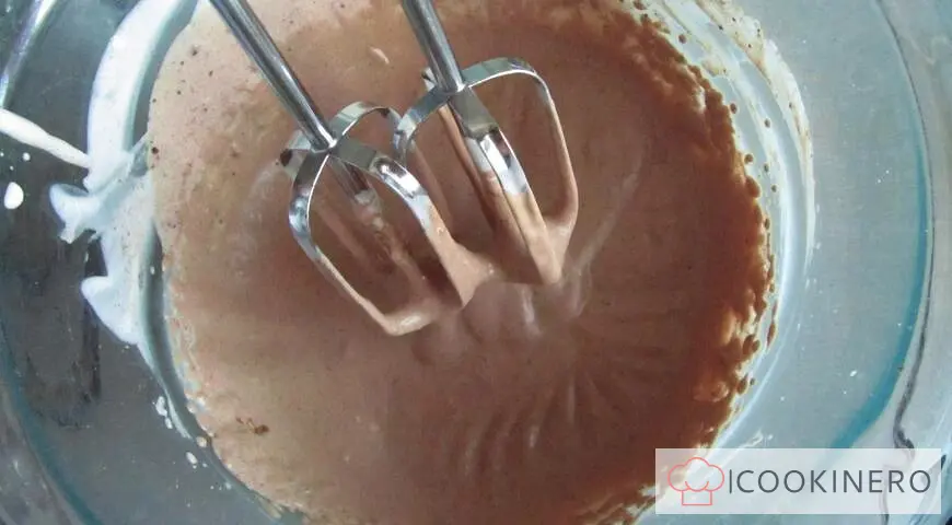 En porciones, tamice la mezcla de harina, cacao y almidón de patata a través de un tamiz en la mezcla de huevo y crema agria, cada vez amasando la masa con una batidora en una dirección a velocidad media (limpiamente, pero no por mucho tiempo). La masa debe resultar homogénea, bastante espesa y fluir en relieve en un recipiente de los batidores.