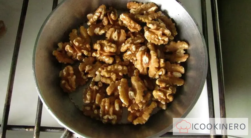 Mientras los pasteles se enfrían, caliente las nueces en el horno durante c. 3,5-4 (190-210°C) mín. 3-5. Luego enfríelos, córtelos en trozos grandes con un cuchillo y tritúrelos con las manos para que se vuelvan grasosos.