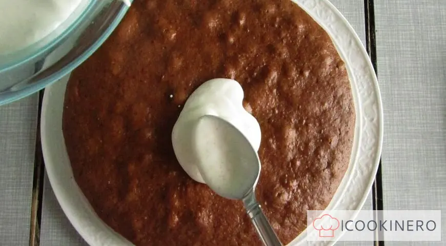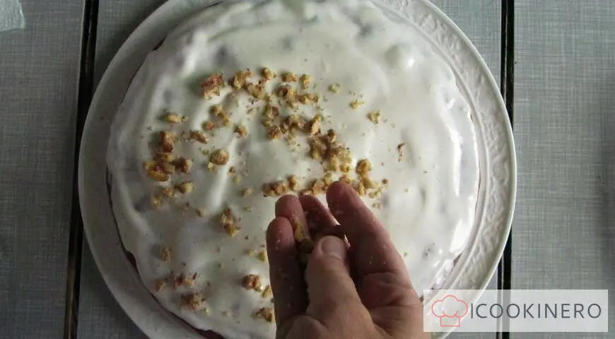 Cubrir el bizcocho de cacao con el segundo bizcocho blanco, presionar ligeramente este último con las manos encima, luego pincelar con otro ⅓ de la nata, también se puede pinchar varias veces con un tenedor o palito de madera (opcional). Después de eso, nivele la superficie de la crema con una cuchara. En el centro del pastel, espolvorea las nueces restantes en forma de círculo.