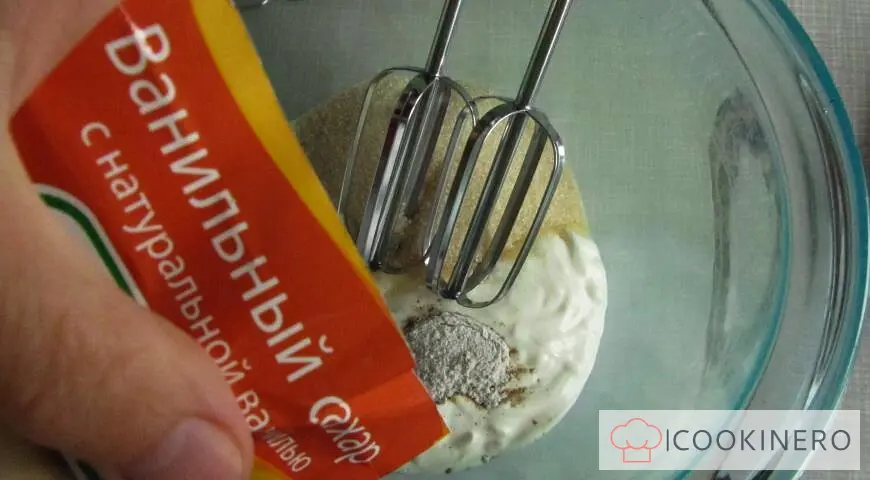 Agregue azúcar de vainilla y crema agria al huevo. Mezcle suavemente, agregue bicarbonato de sodio y mezcle nuevamente.
