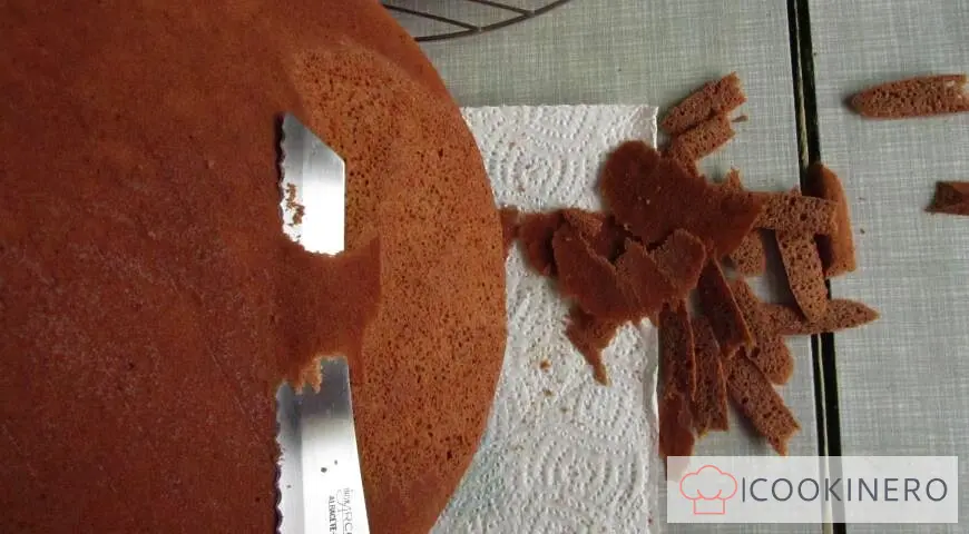 De los pasteles enfriados, si es necesario, corte los lugares quemados (fondo y bordes) con un cuchillo para pan (con movimientos de sierra para no dañar su estructura). Prepara un plato para servir.