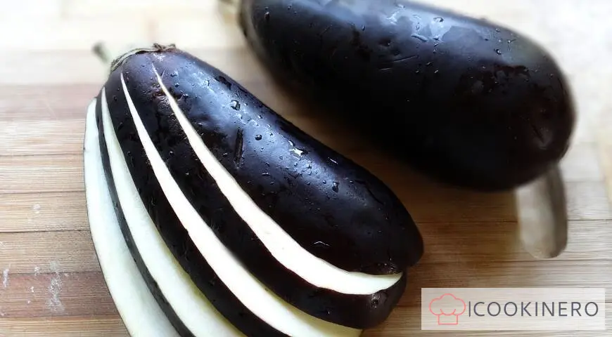 Tagliate le melanzane per il lungo in più pezzi, senza tagliarne un po' la coda.