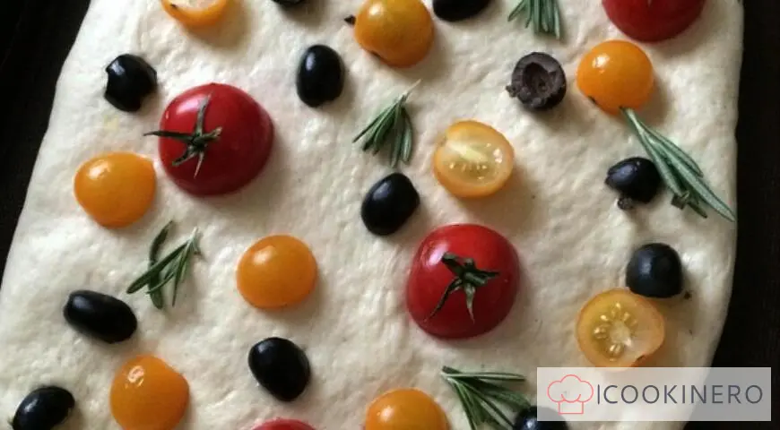 Spremete i pomodorini e le olive sulla superficie della focaccia e lasciate riposare per 20 minuti. far lievitare leggermente l'impasto.