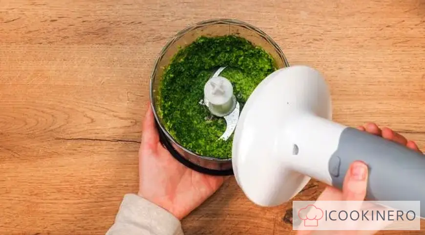 Preparare la salsa al pesto. Per ottenere degli spaghetti al pesto perfetti, prepara la salsa in casa. Mettere tutti gli ingredienti necessari nel contenitore del frullatore o del tritatutto: basilico, parmigiano grattugiato, pinoli, aglio, olio d'oliva. Macinare fino a ottenere una purea.