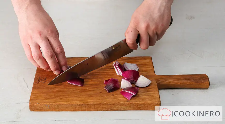 Sbucciate metà di una cipolla rossa. Smontare in bilancia. Tagliate ciascuno a quadrati o semplicemente a fette grandi. Ancora una volta, puoi concentrarti sui cubetti di filetto di pesce.