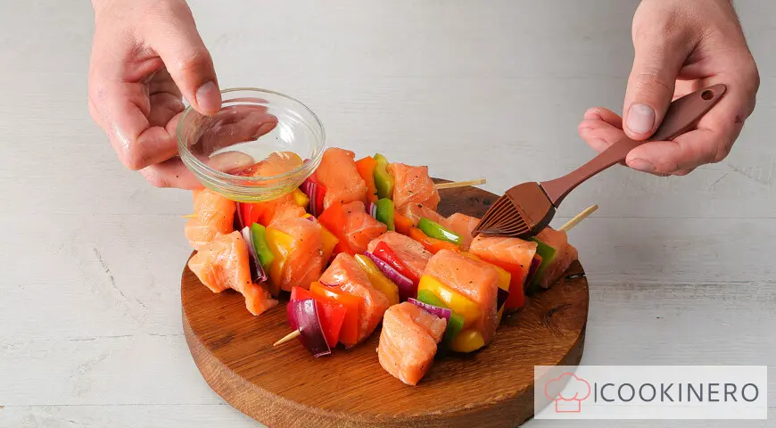 Asciugare leggermente il filetto di salmone per barbecue con carta assorbente da cucina. Quindi infilare negli spiedini, alternando con peperoni dolci e cipolle rosse. Spennellare con olio d'oliva.